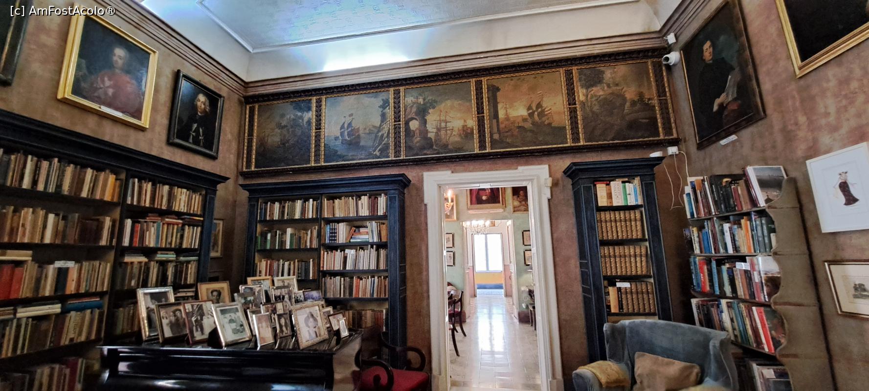 Din camera verde am trecut în bibliotecă, o cameră spațioasă ce abundă de cărți așezate pe rafturi ce ocupă toți pereții. Totuși, în partea superioară, pereții ornsamentați cu picturi sunt despre care se spune ca au decorat nava Marelui Maestru Lascaris, unul dintre conducătorii Ordinului Sf. Ioan. Într-un colț al bibliotecii se observă un ceas care funcționează cu o singură limbă, o ciudățenie care făcea parte din categoria celor ce se ofereau ca dar de nuntă.