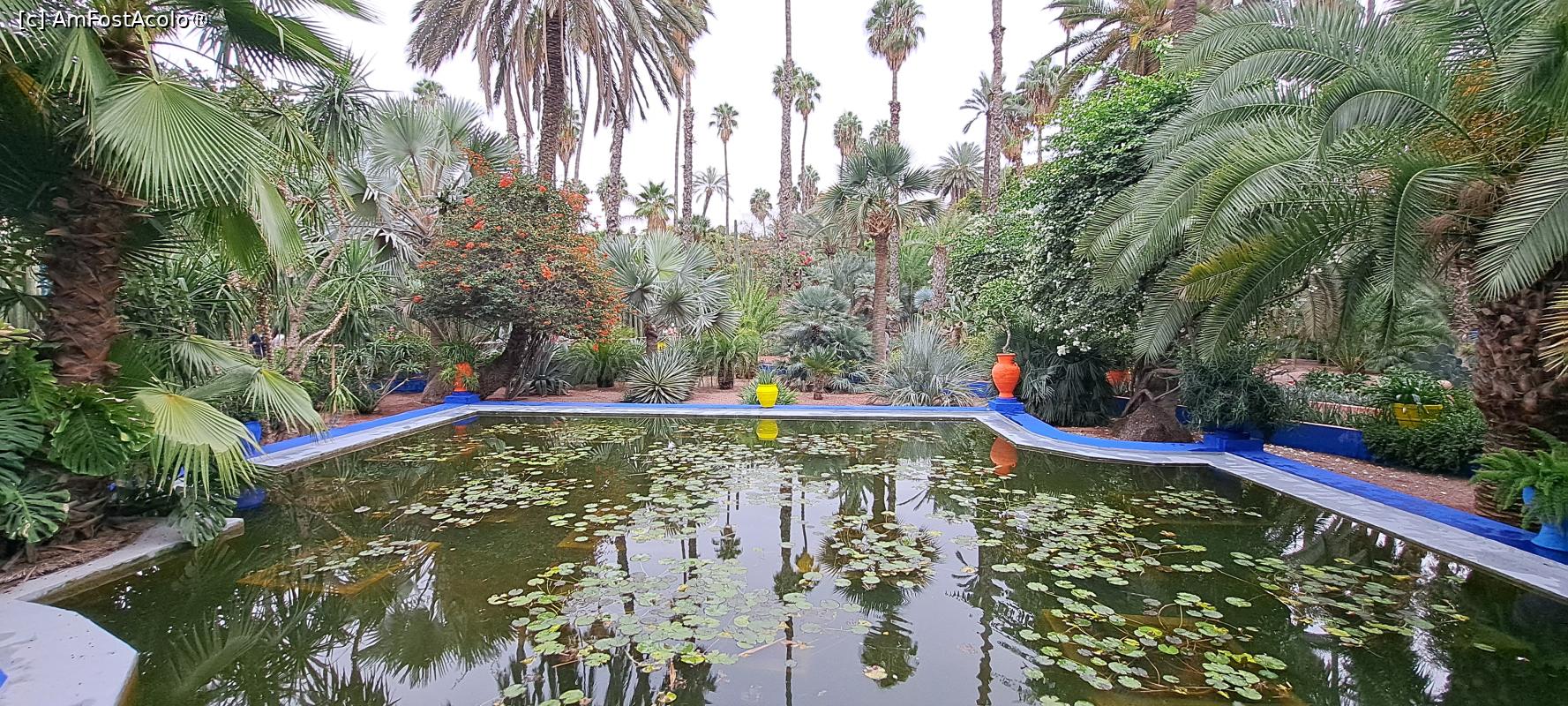 De asemenea, am întâlnit un bazin zugrăvit în albastru Majorelle, îmbrăcat cu nuferi, un heleșteu cu pești portocalii și piscine, chiar una la intrare, decorate de maeștri vestiți. Există bănci și locuri de relaxare peste tot pe marginea aleilor de unde se poate contempla și admira încântătorul areal.