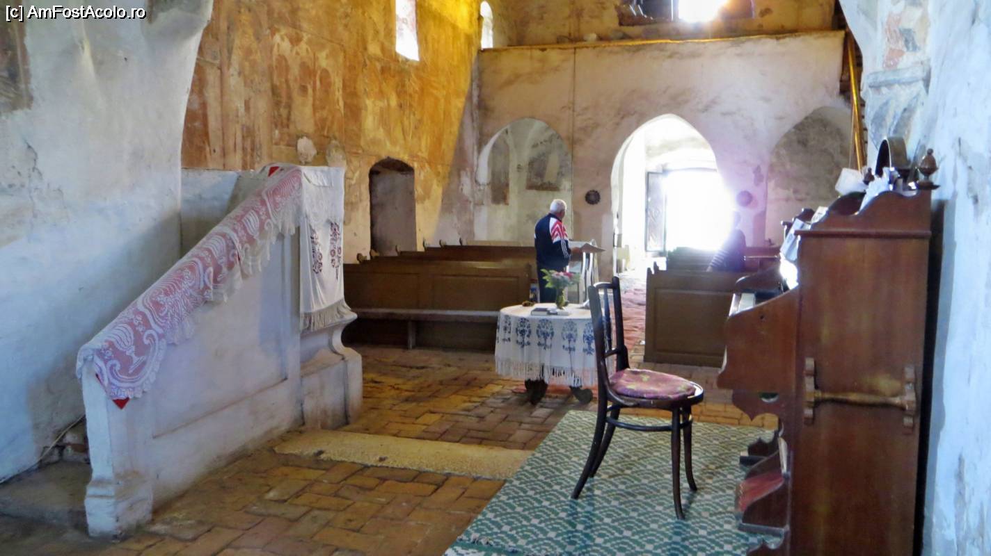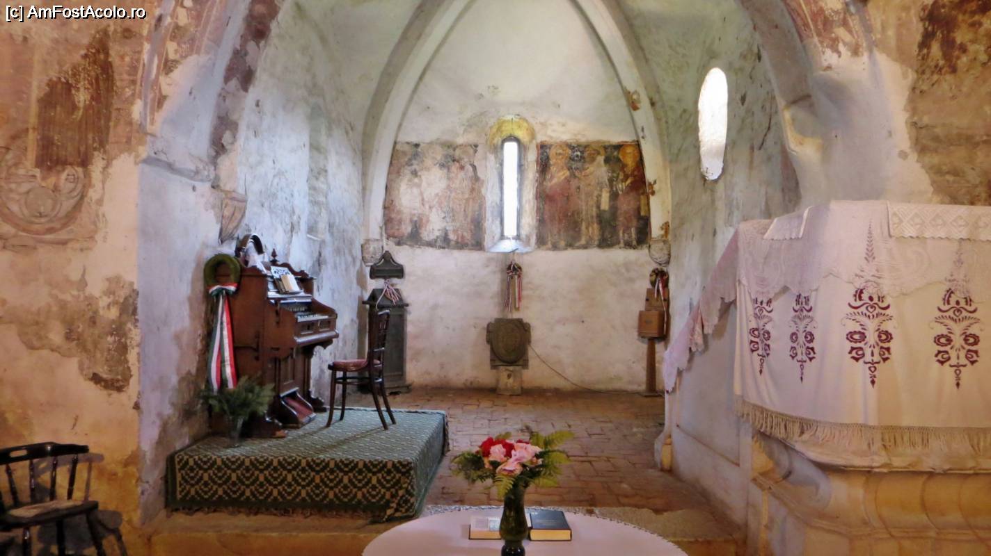 [P03] Vedere din naos spre altar. În partea stână, pe perete, se vede una din crucile de consacrare (stratul 1 de pictură). În altar, pe perete la mijloc, este blazonul familei Kendeffy (Cândea)