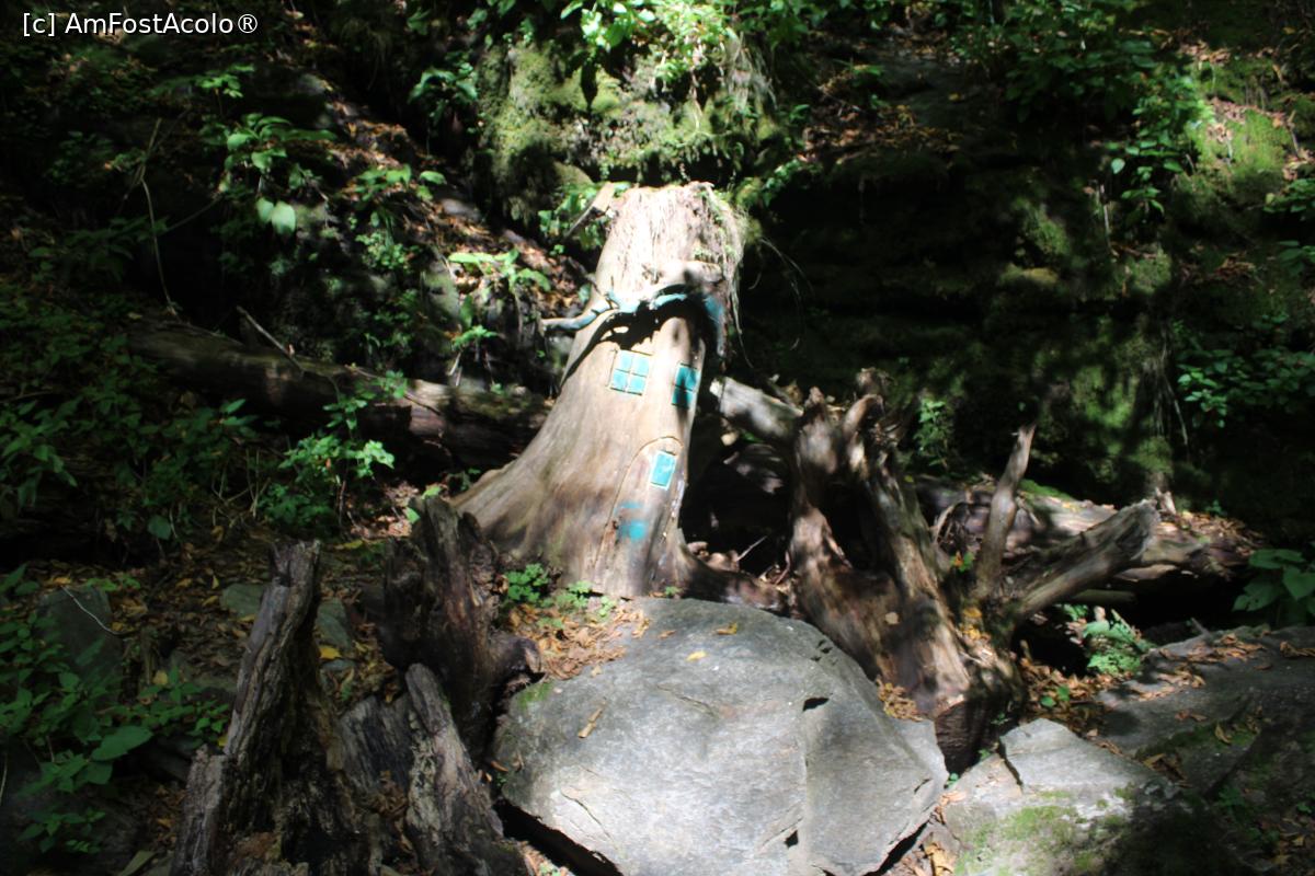 [P14] Poteca turistică spre Cascada Scoruș, Mălaia, Trunchi de copac cu ornamente albastre