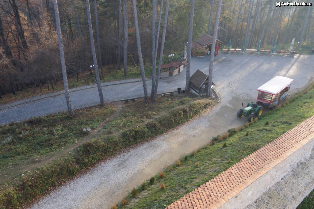 [P146] Vedere din balconul Turnului Bathory. Micul platou unde opresc tractorașele care transportă turiștii la cetate.