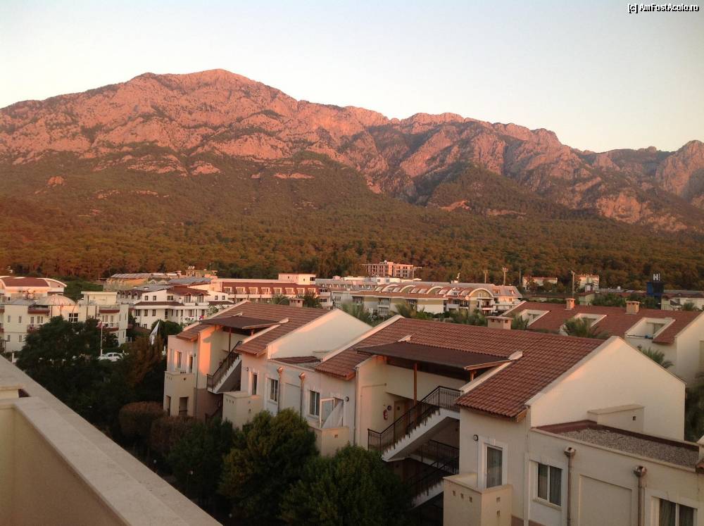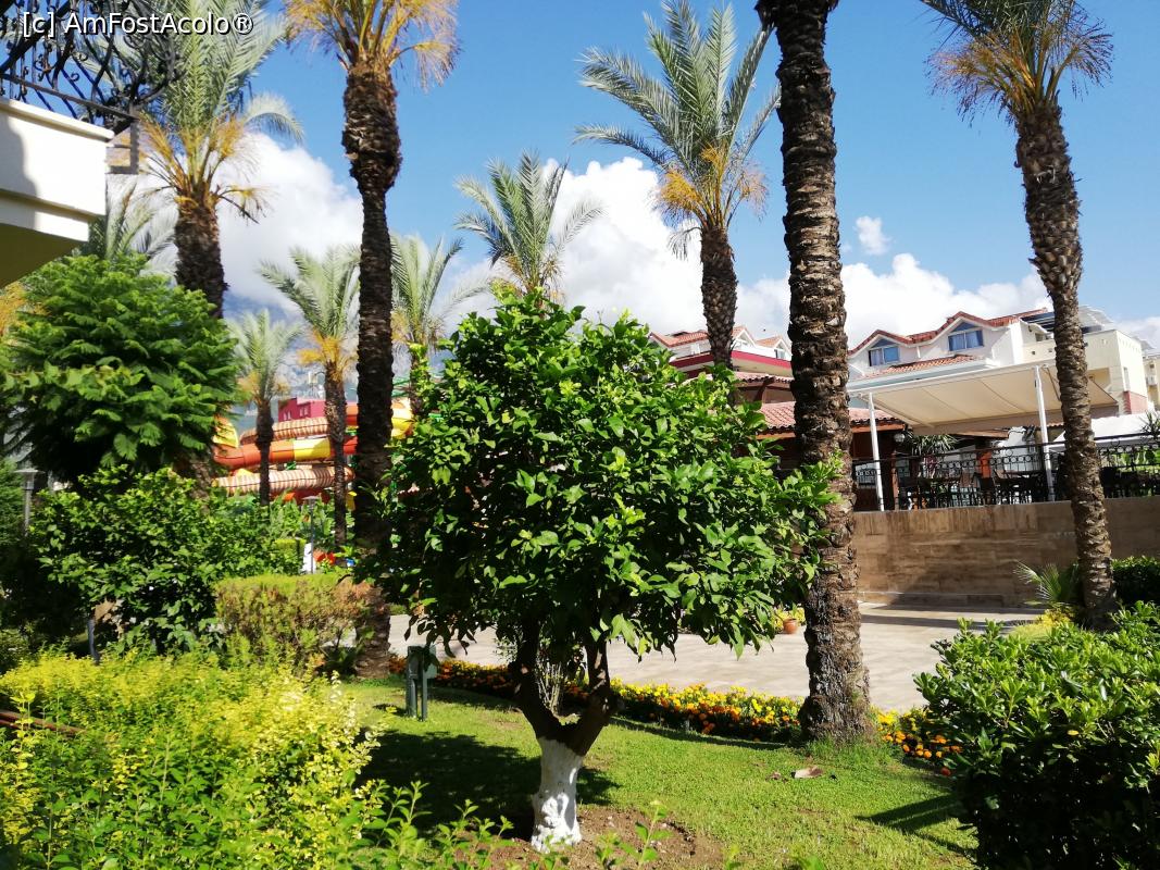 [P04] vedere de la balconul camerei. O gradina impresionanta de citrice, flori si multi palmieri. In fundal se vad muntii care sunt foarte aproape de statiune