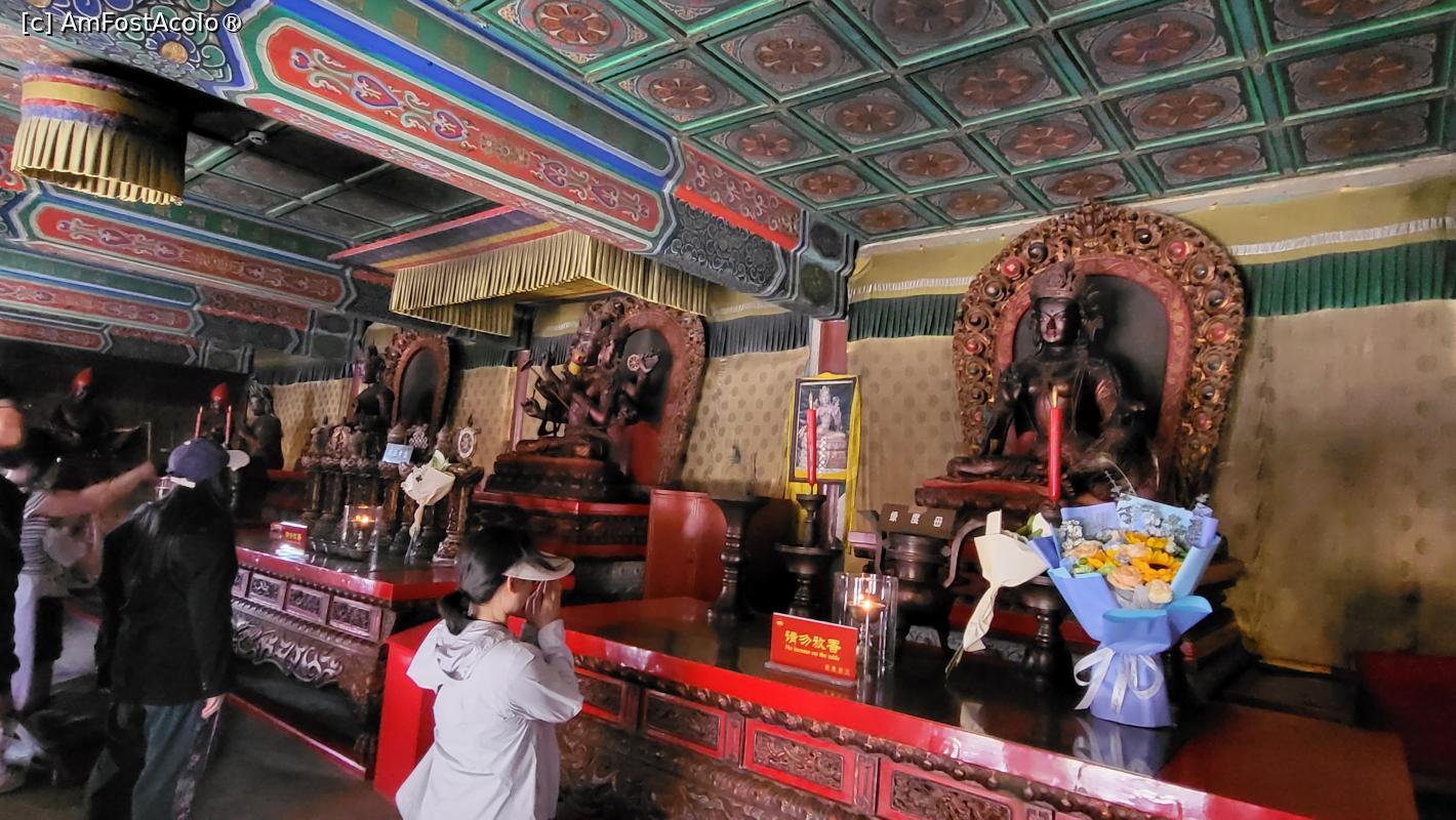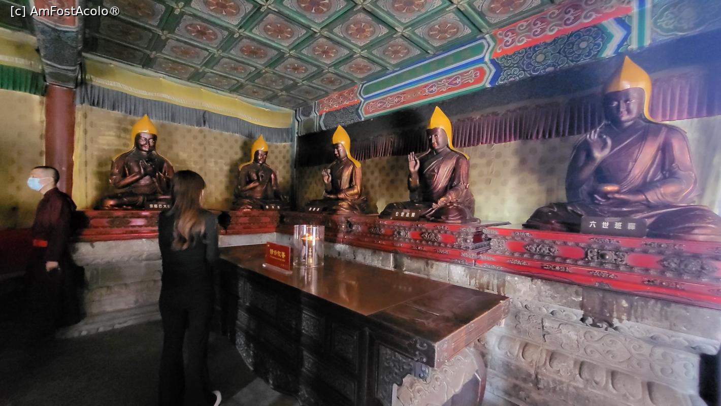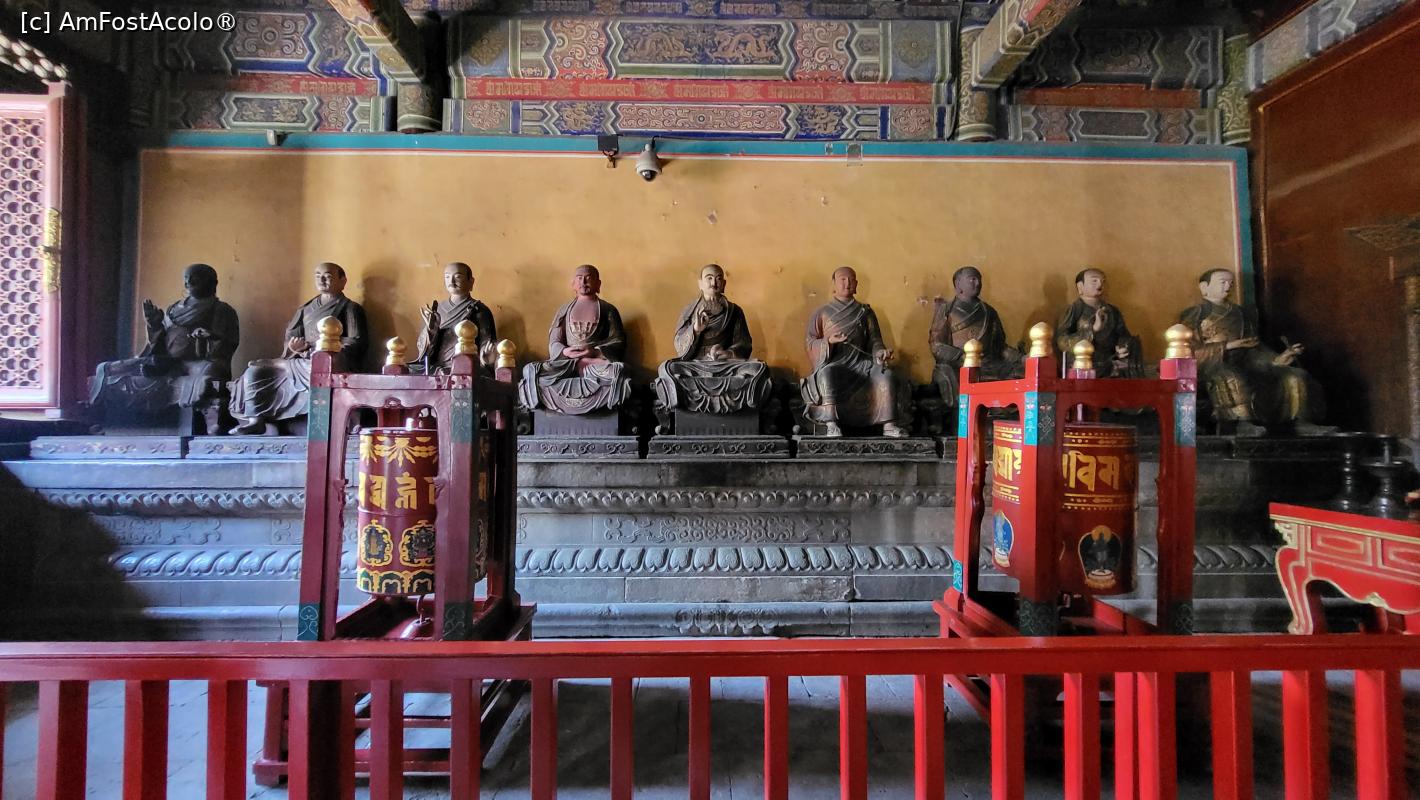 [P17] O statuie mare a lui Tsong Kha-pa, fondatorul lamaismului, este amplasata pe altarul salii, impreuna cu ofrande. In spatele acestei statui se afla Muntele Arhat, care are 500 de Arhati, realizati din cinci tipuri de metale - aur, argint, cupru, fier si cositor, modelati in diferite ipostaze.