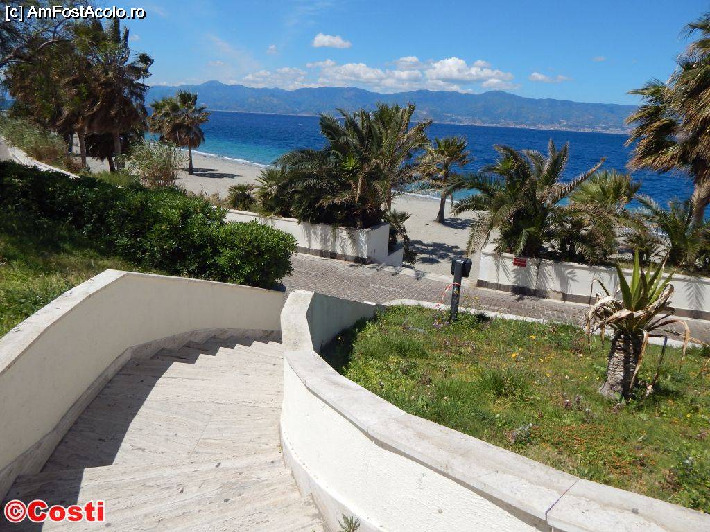 [P18] Ieșire din Lungomare Falcomatà spre plajă. În zare, se vede Sicilia, peste strâmtoarea Messina.