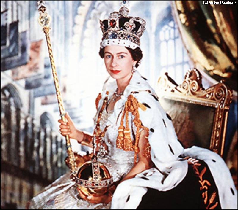 [P22] Elizabeth II la incoronare. In mana dreapta are Sceptrul Suveranului - il el se poate vedea Diamantul Steau Africii. In mana stanga tine "The Orb" - globul de aur. Pe cap are coroana The Imperial State Crown. Poza luata de pe net.