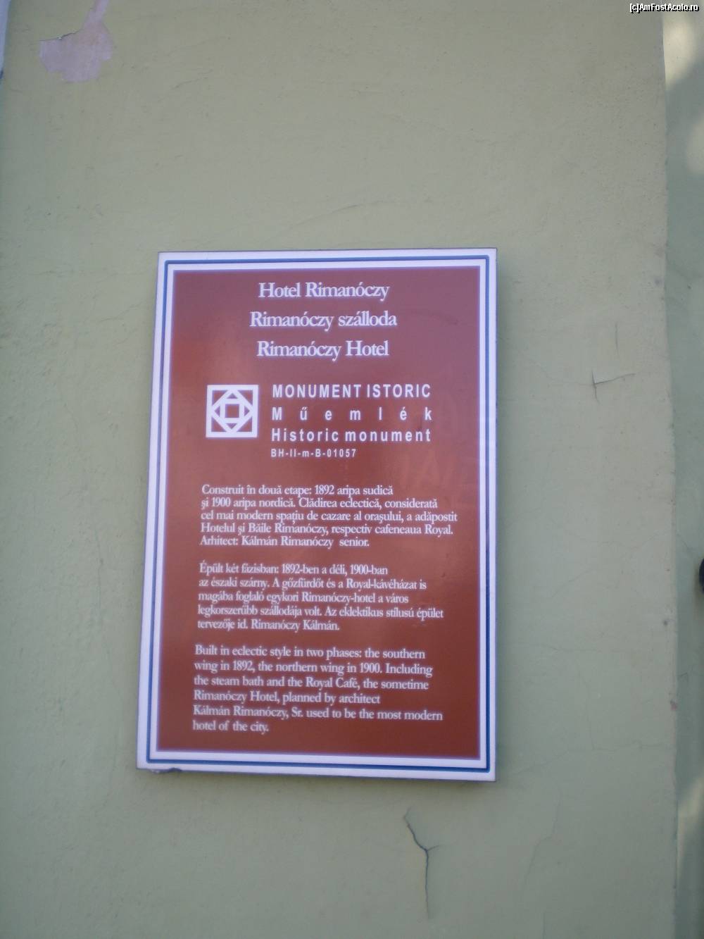 [P20] Oradea - placuta "informativa" la cladirea fostului Hotel Rimanoczy. Fiecare cladire - monument are o astfel de placa.
