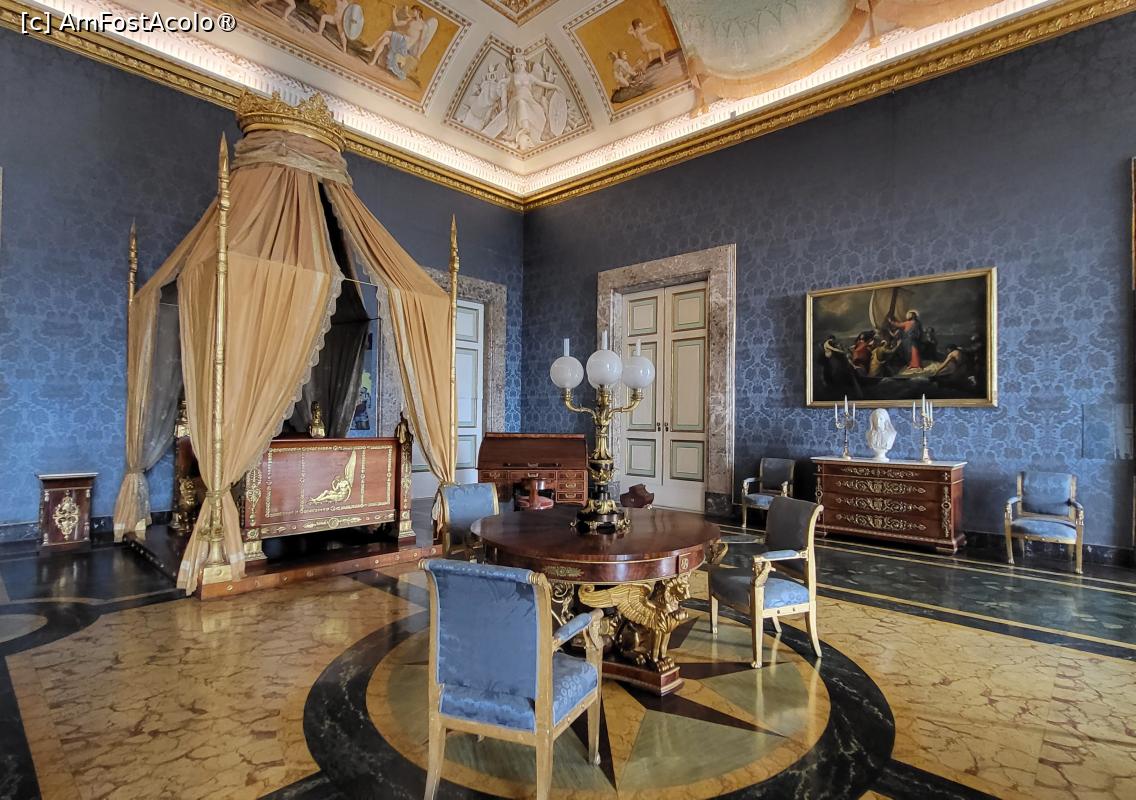 [P57] Dormitorul lui Francisc al II-lea este decorat in stil Empire, in lemn de mahon si bronz aurit, constand intr-un pat cu baldachin, 2 masute de pat, 2 comode cu sertare, un birou de scris si o masa rotunda cu trei picioare in forma de leu inaripat. Pe cele doua comode sunt statui din marmura.