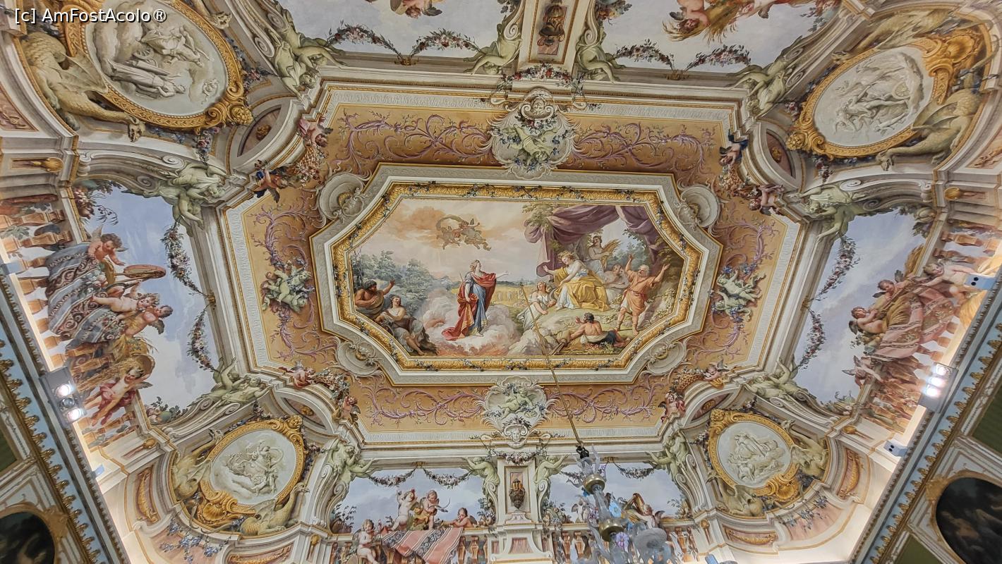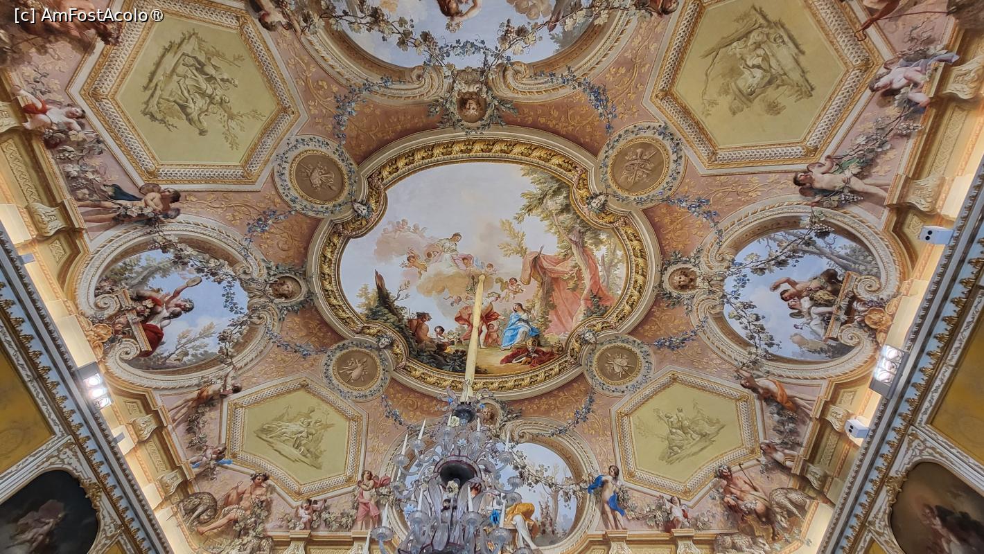 [P60] Bolta tavanului este pictata in tehnica trompe l’oeil, tehnica ce creeaza iluzie vizuala, avand impresia ca personajele stau sa cada peste noi, cu atat mai mult cu cat acestea participa la o petrecere unde vedeta este licoarea lui Bachus.