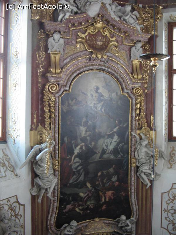 [P08] Principala pictura este cea a Invierii lui Iisus Hristos. Doua sculpturi, ale Sfantului Ioan Botezatorul si Sfantului Petru, impodobesc interioarele capelei.