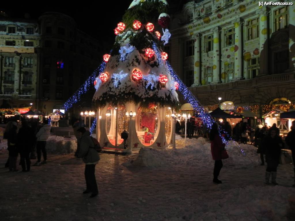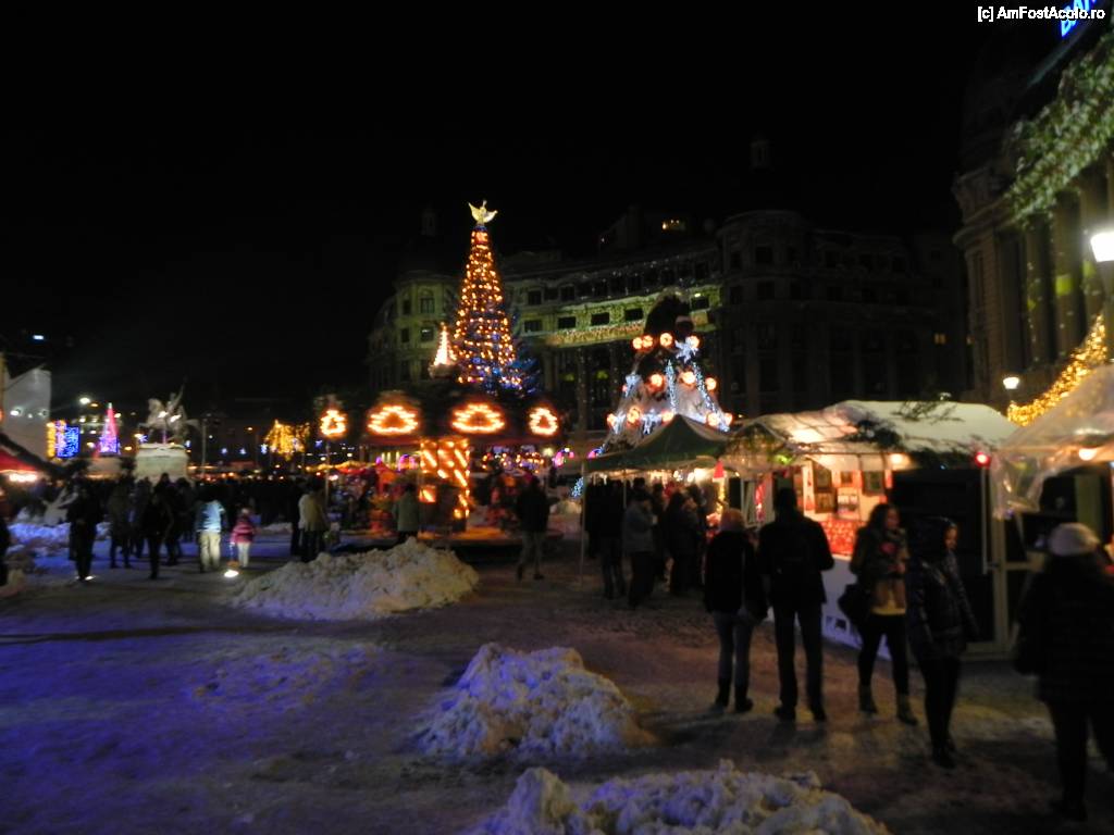 [P04] Imagine de ansamblu, în care se vede bradul, caruselul, distanța dintre tarabe și mormanele de zăpadă