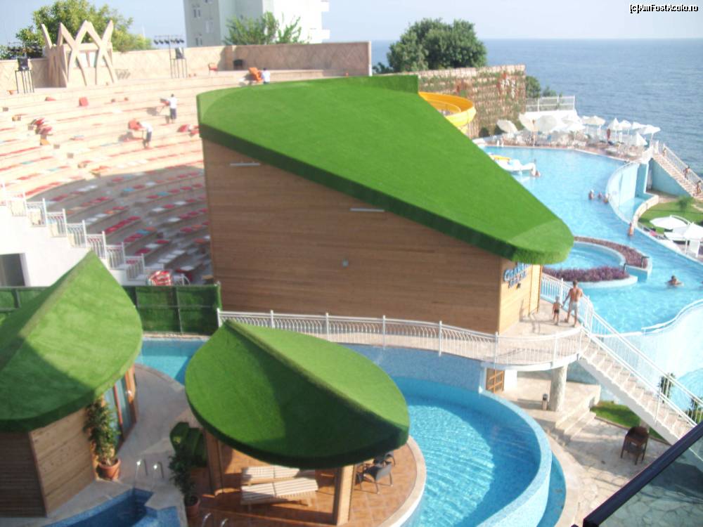 [P22] Vedere dinspre lobby. Observati topoganele de apa, amfiteatrul iar, in stanga jos, casutele de VIP, care nu mi-au placut deloc. Ceea ce observati verde este iarba sintetica ... despre care mai bine nu mai vorbesc.