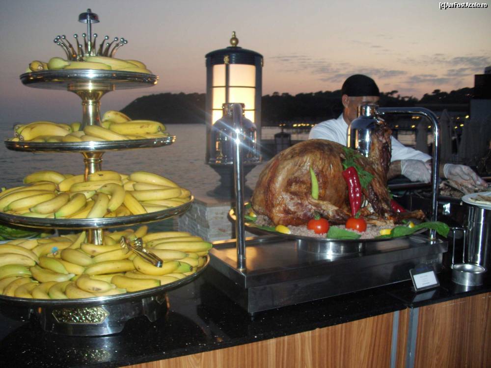 [P23] Oaie la protap si banane, servite doar deoarece era ramadam-bairam. Sa nu va asteptati sa serviti prea des carne de oaie, nici macar la restaurantul a-la-carte turcesc. Baza o reprezinta (cea mai) ieftina si eterna carne de pui... Ceea ce este in fotografie se vede probabil doar o data pe an...