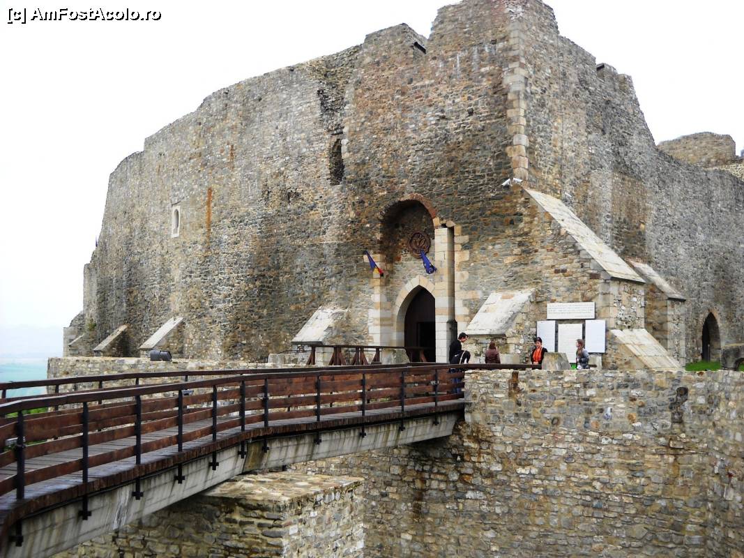 [P07] Capătul podului cu trapa pentru oaspeţii nepoftiţi ("cursa de şobolani"). În spate, vechiul fort muşatin cu poarta de intrare, panoul trilingv cu indicaţii istorice şi cu capul de bour deasupra.