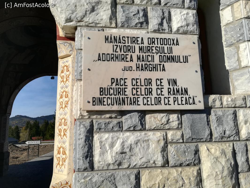 [P03] Placa de pe zidul de piatră, aflată chiar la poarta de intrare la mănăstirea Izvorul Mureșului