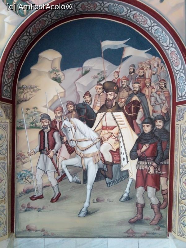 [P07] Mănăstirea Izvorul Mureșului - frescă de la parterul corpului de chilii, reprezentându-l pe Mihai Viteazul intrând în Ardeal
