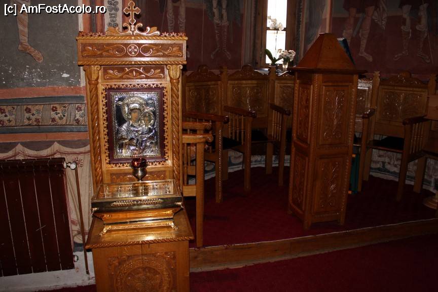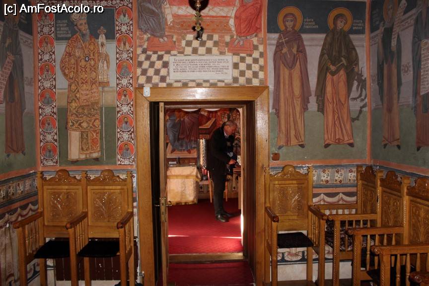 [P23] Mânăstirea Robaia, pronaosul cu scaune frumos lucrate, în stânga este pictat actualul arhiepiscop Calinic Argeșeanul