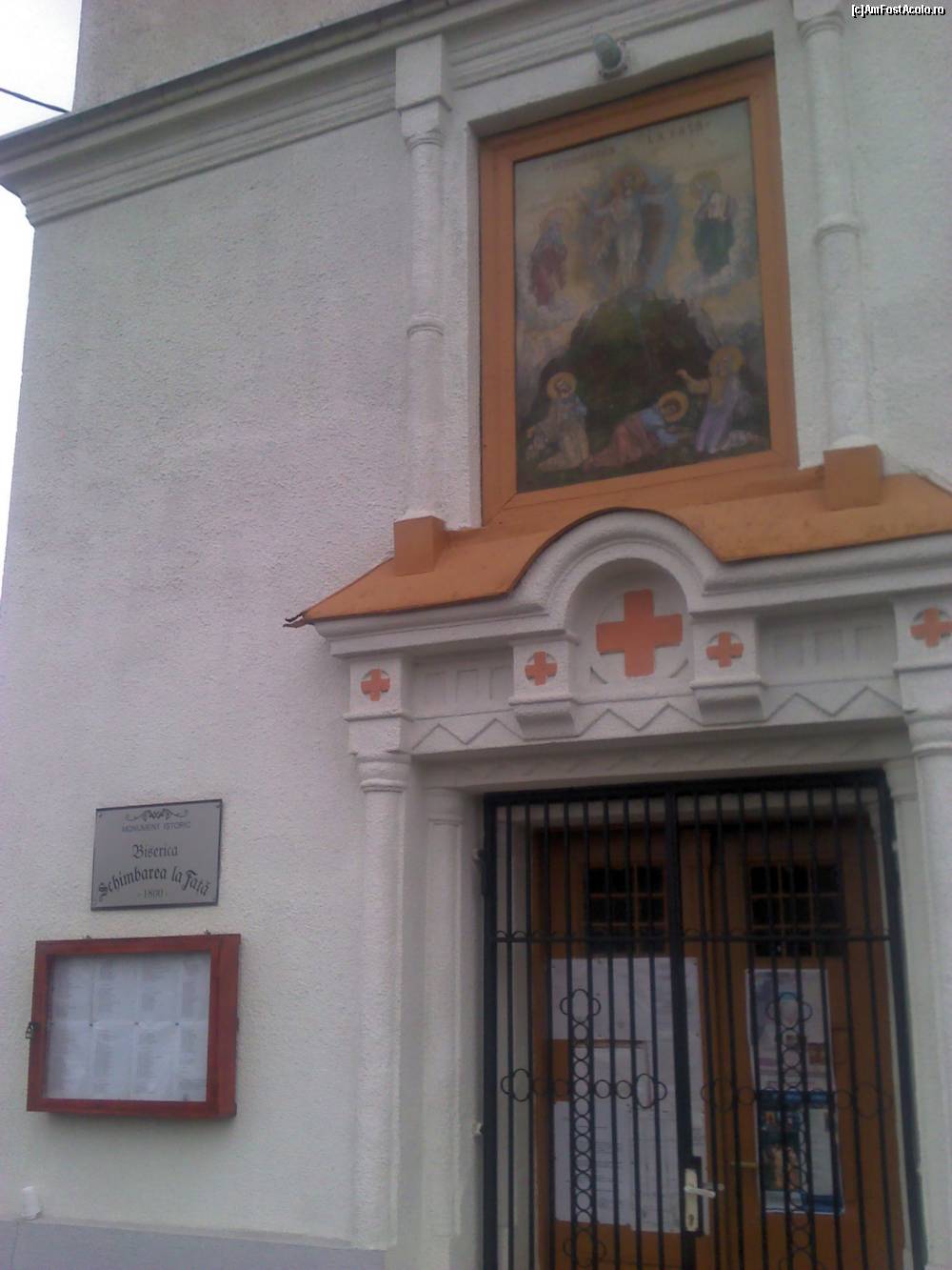 [P03] Biserica „Schimbarea la faţă” - intrarea; placa ce ne anunță că e vorba despre un monument istoric și o grămadă de „maculatură” cu diferite anunțuri, mai puțin o mică listă cu date concrete despre biserică! Pictura ce ilustrează minunea Schimbării la Față de pe muntele Tabor e foarte frumoasă.