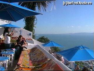 [P03] In minunatul cartier Sidi Bou Said din Tunis, in cel mai inalt punct se afla o ceainarie deosebit de pitoreasca, unde turistii savureaza un ceai din seminte de pin sau alte minunatii. Se vad Muntii Atlas si Marea Mediterana