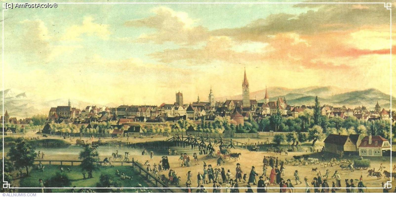 [P05] Franz Neuhauser - Târgul din Piața Mare (cca 1790). De remarcat acoperișul Turnului Sfatului: acele patru turnulețe înseamnă că orașul avea dreptul de a pronunța pedeapsa cu moartea în cadrul unui proces. De asemenea, de observat clădirile din dreapta: aveau mai multe etaje decât au azi.