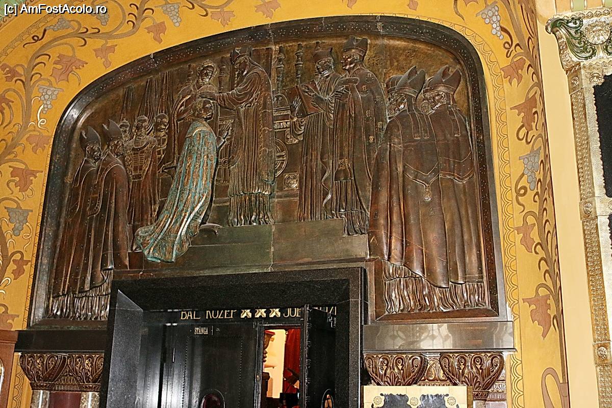 [P04] Palatul Culturii din Tirgu-Mures, intrarea in Sala Mare de spectacole cu basorelieful din broz cu o greutate de o tona, reprezentand incoronarea imparatului Franz Josef I