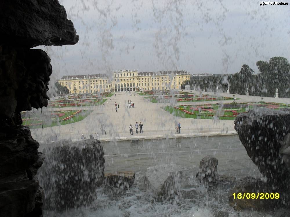 [P06] Palatul Schonbrunn vazut prin perdeaua de apa a Fantanii lui Neptun(fantana ce inchide platoul Marelui Parter)