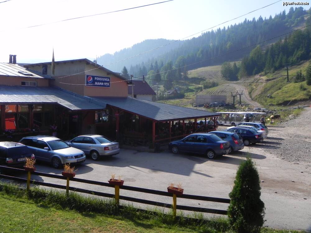 [P55] Pensiunea din Garda se Sus, "Mama Uta", unde se afla masinutele pentru Scarisoara garate; cine a venit in Apuseni, musai trebuie sa manance aici, spun turistii; noi nu am ajuns, deci trebuie sa ne intoarcem, sa nu stricam legenda...