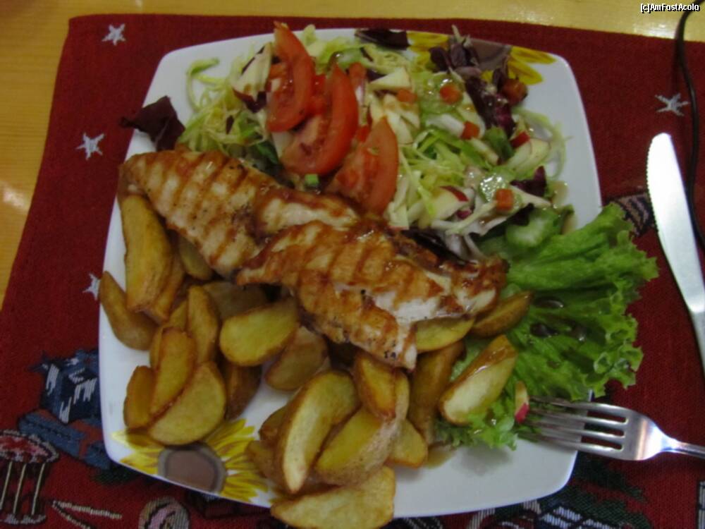 Piept de pui la gratar, cu cartofi prajiti si salata