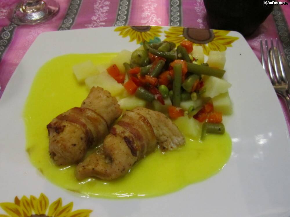 Muschi de porc invelit in costita afumata, cu cartofi natur, legume si un sos dulce-acrisor
