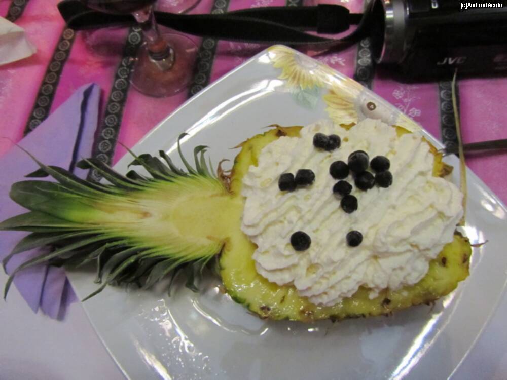 Desert - Salata de fructe cu frisca intr-o prezentare inedita, intr-un ananas taiat pe jumatate