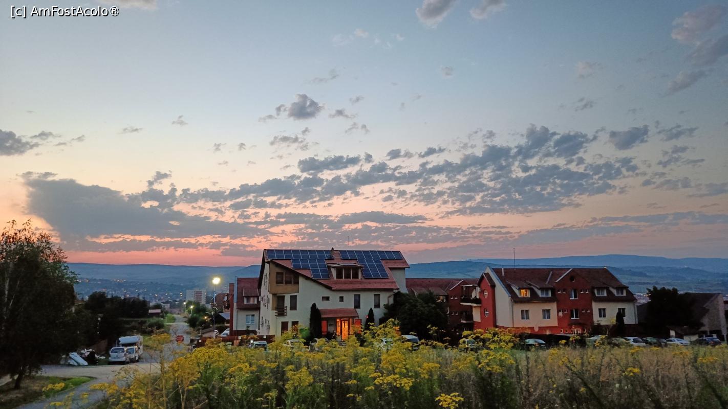 [P01] Pensiunea Panorama la ceas de seară (clădirea cu panouri solare pe acoperiș).