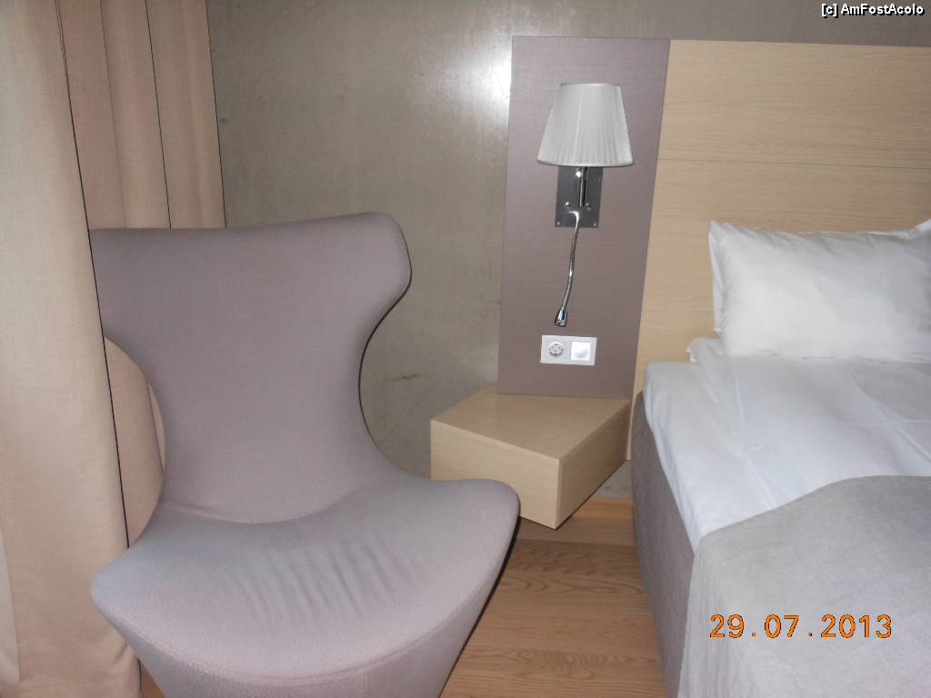 [P20] Hotel Quality Expo - Oslo. Camera 170, un fotoliu modern şi o veioză cu dublă iluminare.