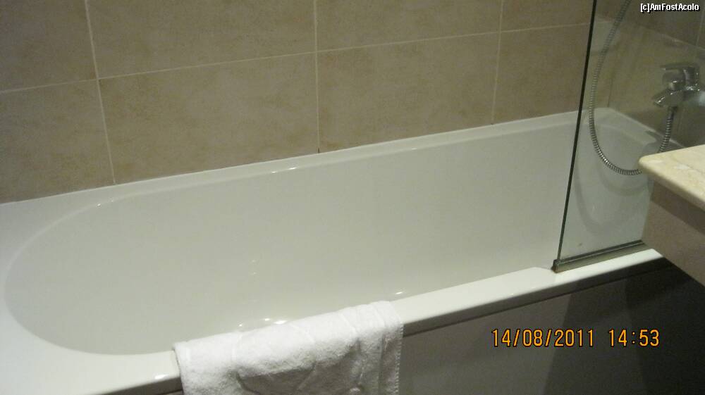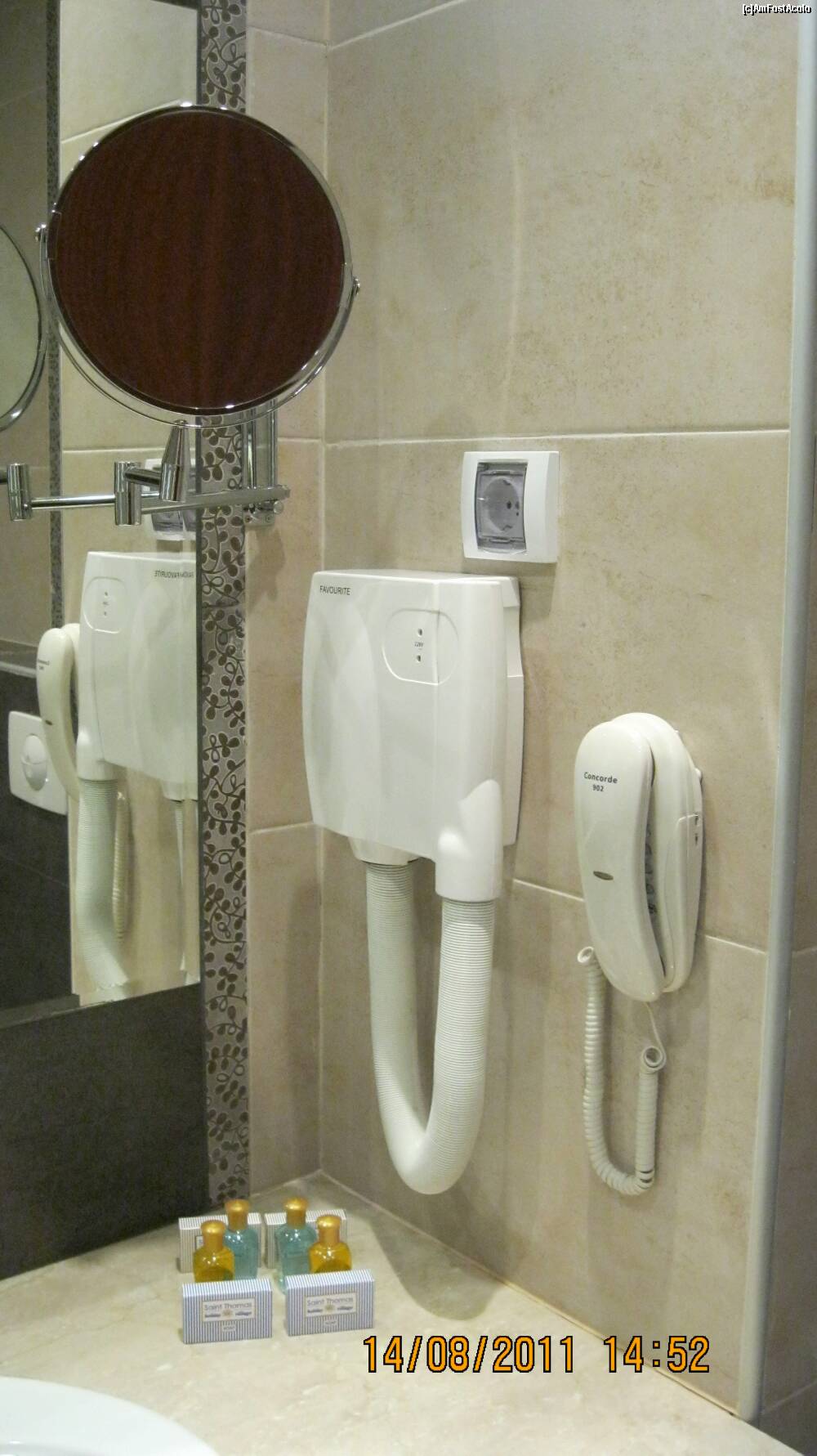 [P34] Baia: sampoane, gel de dus, sapunuri, uscator de par, telefon si... langa oglinda mare atasata o oglinjoara rotunda cu marit fata, care cred eu ca era un fel de oglinda retrovizoare ca sa vezi daca esti urmarit de cineva