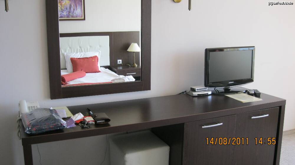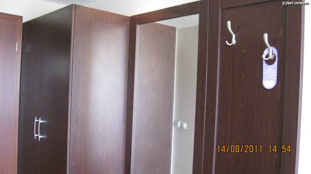 [P36] pe holul de la intrarea in camera un cuier cu bancuta si o enorma oglinda, precum si un sifonier dotat cu suport cu umerase, rafturi si un seif pentru obiecte personale de valoare cum ar fi: bani, aur, argintarie, sotie sau poate soacra. Era gratuit dar trebuia sa ceri un cod de la receptie.