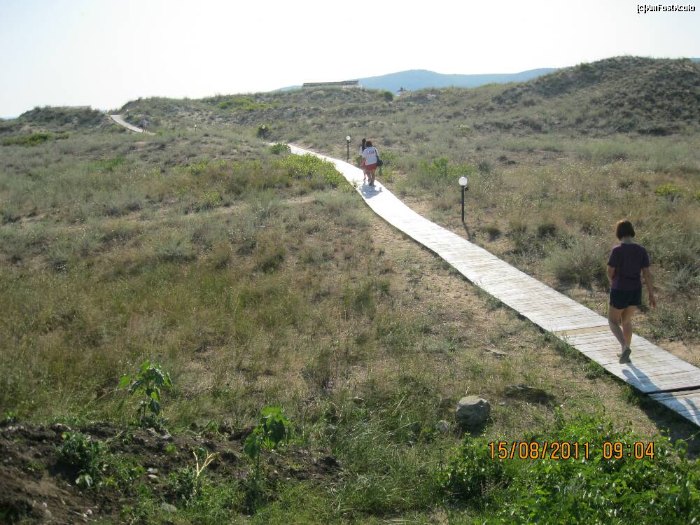 [P44] ,,Aleea,, din scanduri, unele crapate si rupte, care duce spre plaja Arkutino aflata de dupa acele dune.
