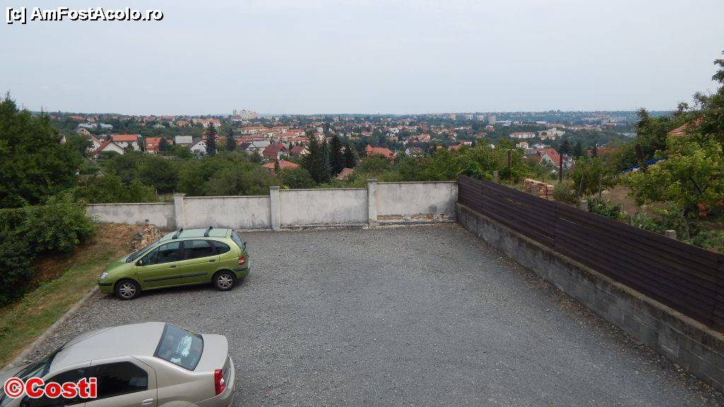 [P03] Vedere spre parcarea pensiunii și spre oraș, de la fereastra camerei în care am stat.