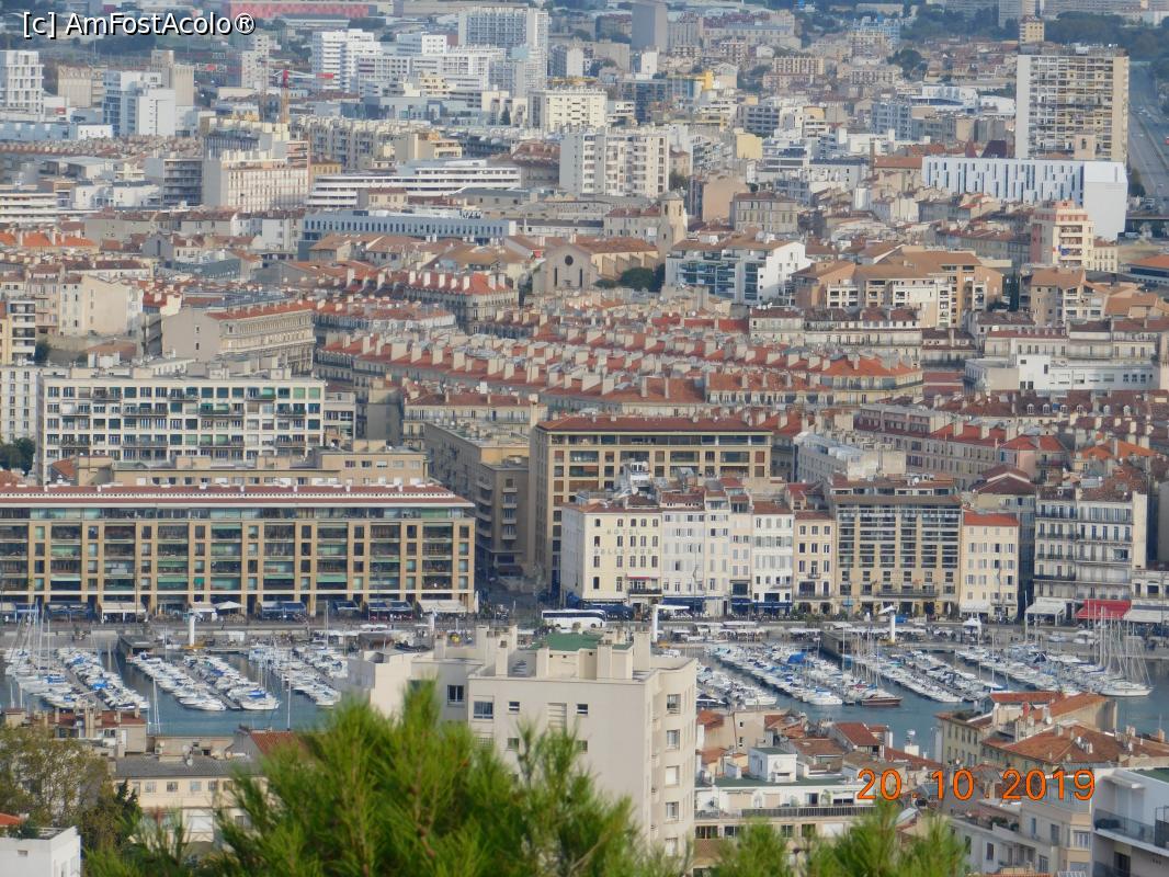 [P03] Chiar şi de la Bazilica Notre Dame de la Garde privind spre Vieux Port, sus, în dreapta, clădirea Toyoko Inn se vede albă şi un pic altfel faţă de restul edificiilor