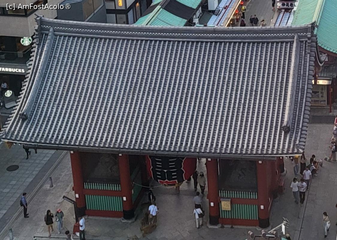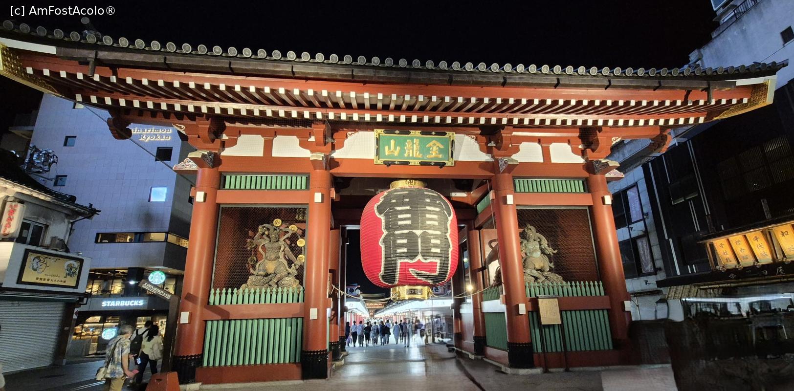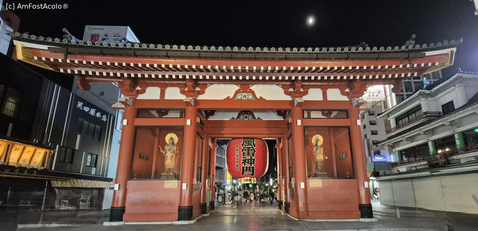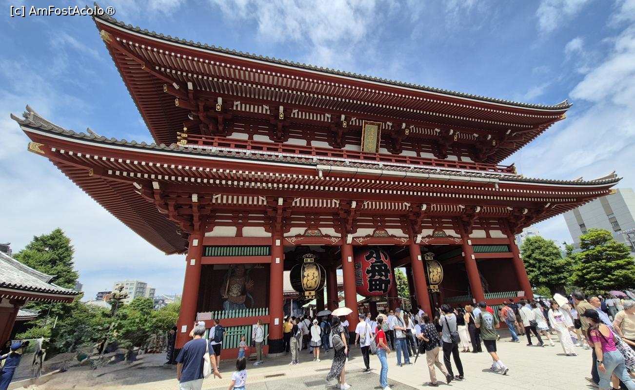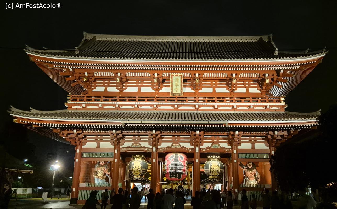 [P01] Cea mai importanta si aglomerata poarta de intrare in templul Senso-Ji este Poarta Kaminarimon, inalta de aproape 12 metri, construita initial de un comandant militar in anul 942. Statuile Zeului vantului si a Zeului tunetului au fost asezate pentru a pazi templul de dezastrele naturale. Poarta a ars intr-un incendiu masiv in decembrie 1865, iar 95 de ani mai tarziu a fost reconstruita.