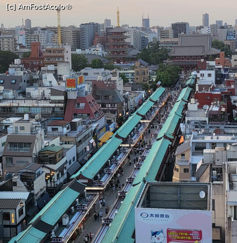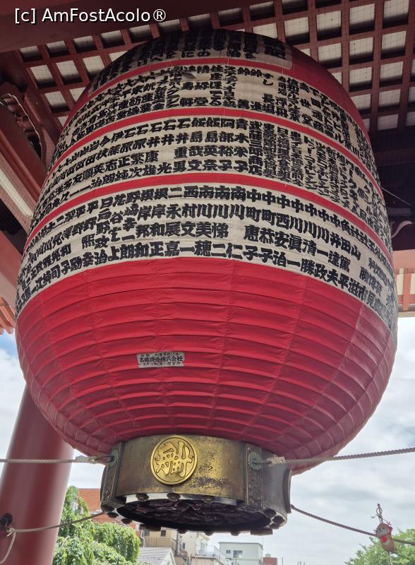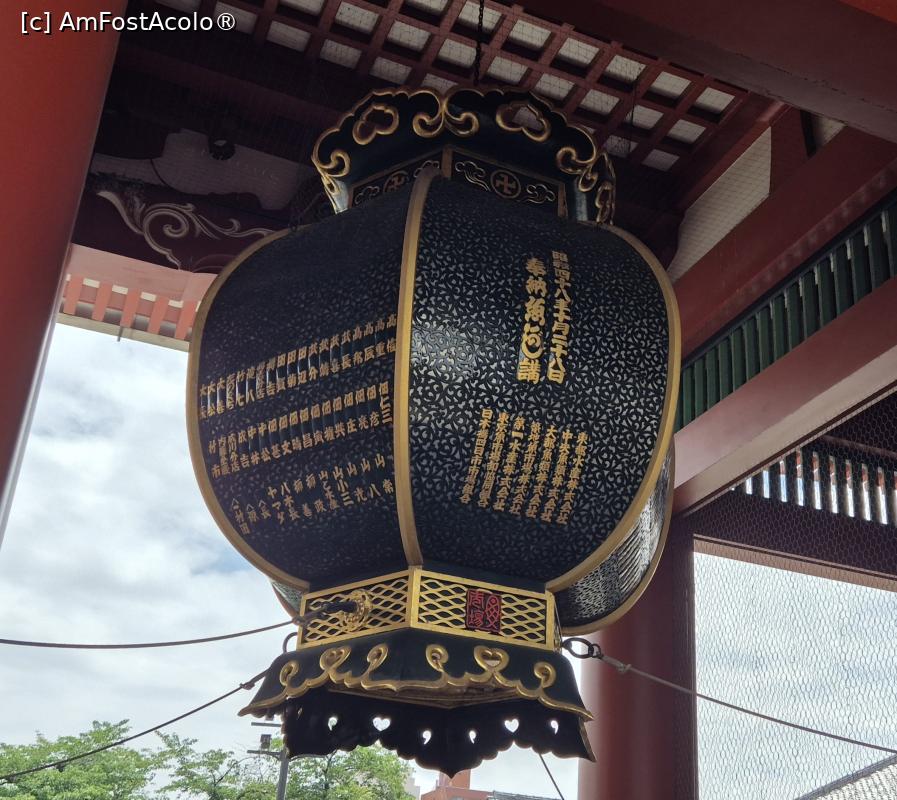 [P02] Impresionant este felinarul de hartie, imens, agatat de Poarta Kaminarimon, ce a devenit simbolul Asakusei. Pictat in tonuri vii de rosu si negru pentru a sugera fulgerele si norii de furtuna, cantareste aproximativ 700 de kilograme, are aproape 4 metri inaltime si 3,3 metri in diametru. Felinarul original a fost realizat in 1971, iar la fiecare zece ani se schimba cu unul nou.