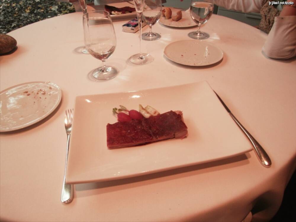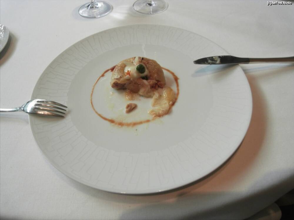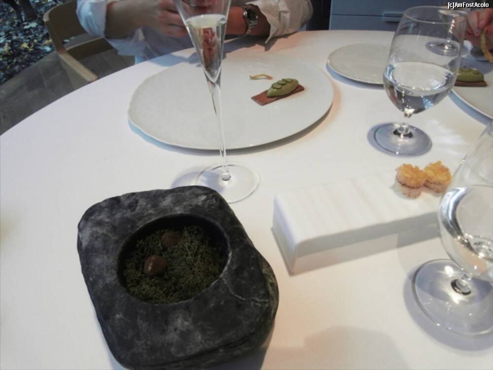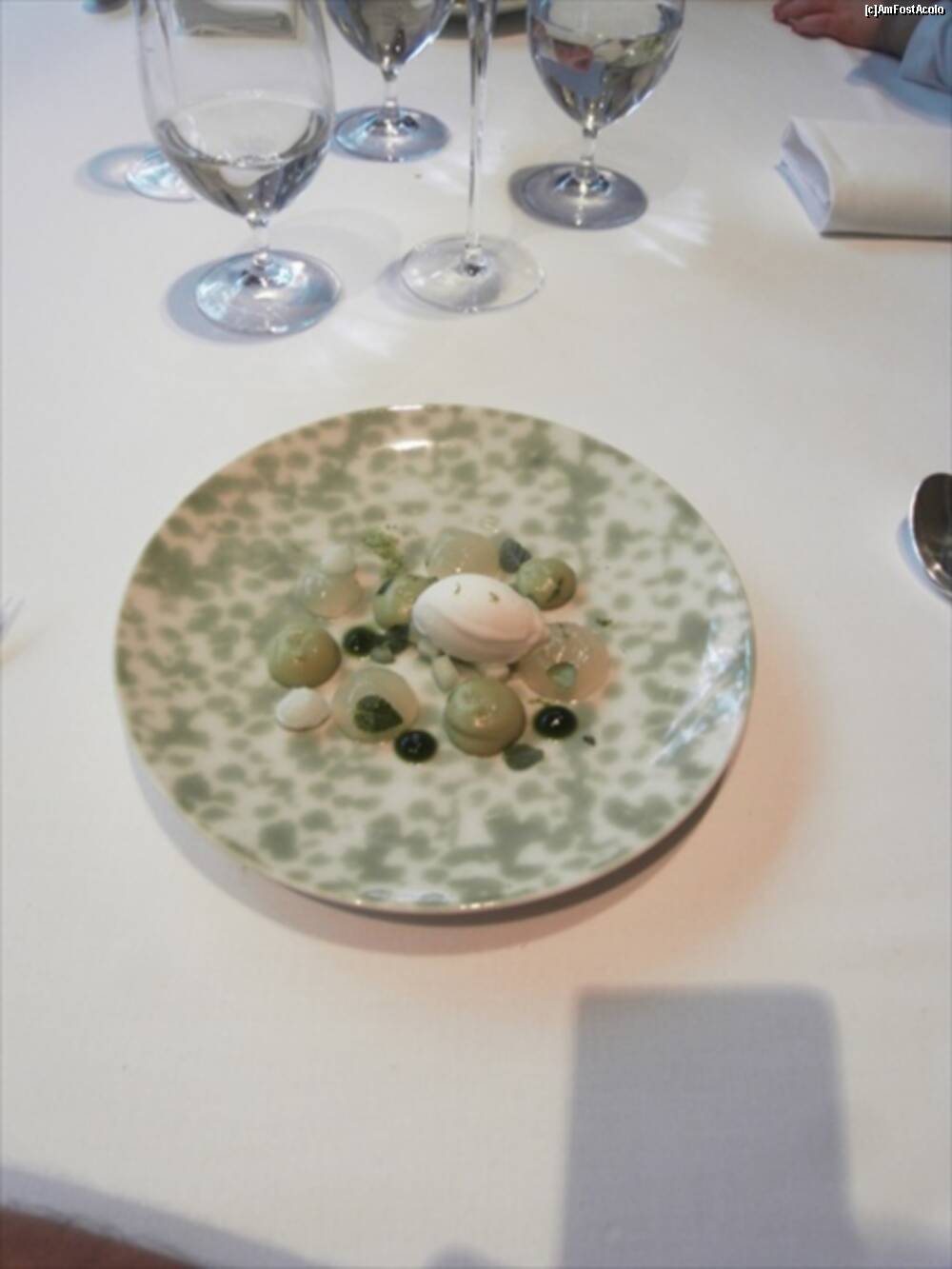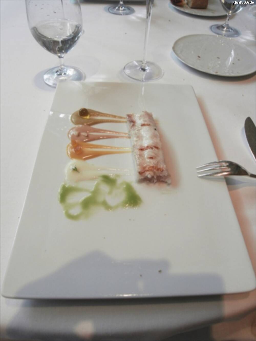 [P13] Astea din bolovanul taiat cred ca erau "Truffled brioche" ..rele cu draci. Fuseseram atentionati sa nu mancam si ierburile alea :)) Bine ca mi-au zis. In farfurie cred ca era un "Zucchini omelette" si in dreapta "Ring Calamar Adaptation"