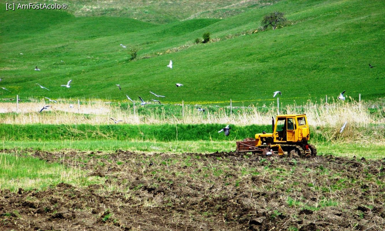 [P03] Zburătoare atacând un buldozer. Probabil că păsările încearcă să profite de gângăniile aduse la zi de plugul tras de buldozer.