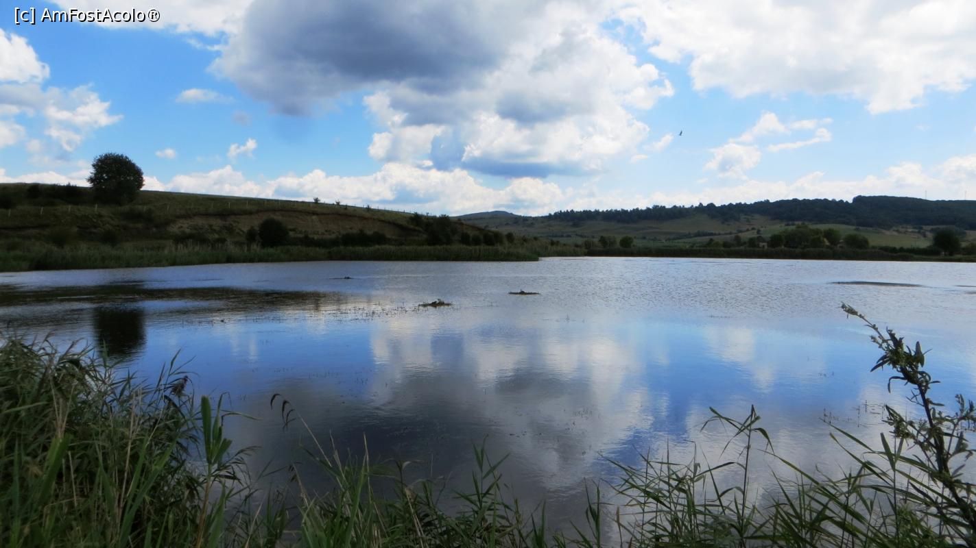 [P11] Un iaz aproape golit de apă cu ”prădătorii” în acțiune. În spate se vede satul Sânpaul.