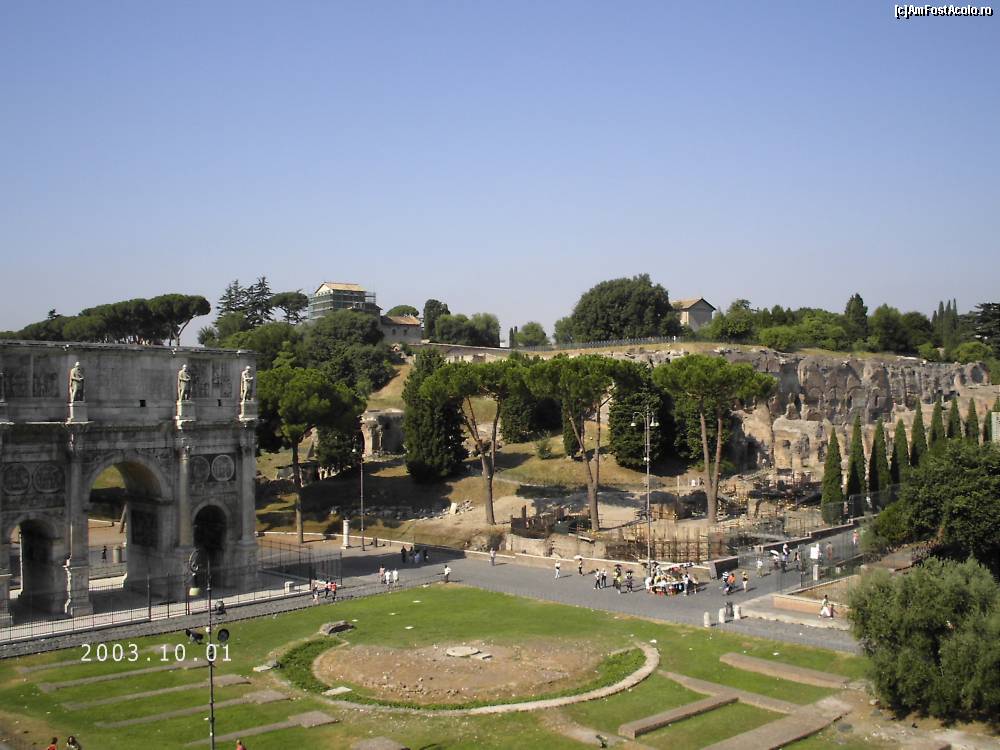 [P11] Vedere din Colosseum spre colina Palatino, în plan secund. În prim-plan, Arco di Costantino şi alături ruinele Casei Aurite (Domo Aurea), palatul lui Nero şi ale fântânii Meta Sudans