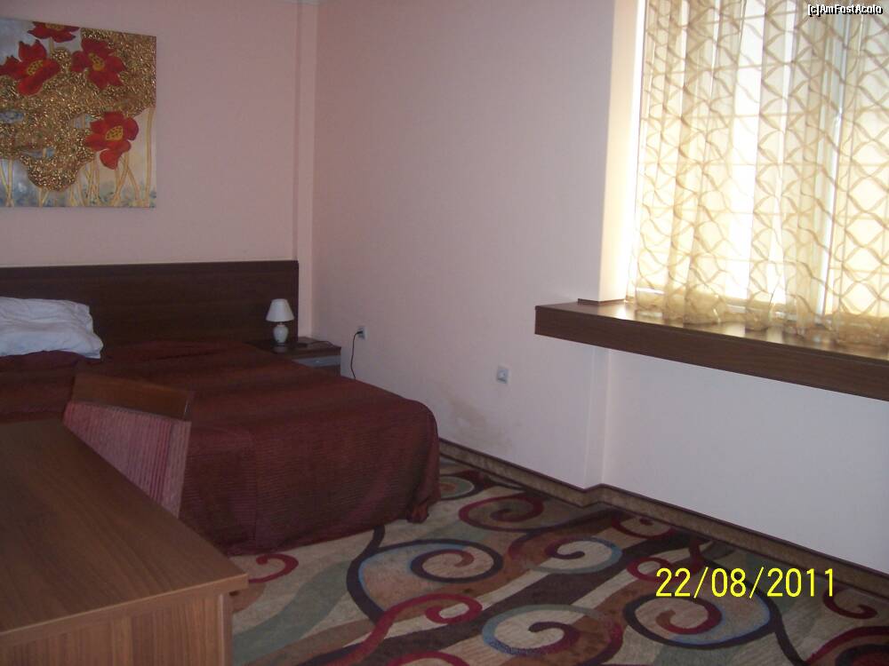 La intoarcerea din Grecia in luna august, am dormit o noapte in acest hotel care ne-a surprins realmente. Facusem rezervare pe mail, cu vreo 2-3 saptamani inainte: un studio la 25€/noapte (luasem doua). L-am gasit foarte usor, se afla exact la intrarea in oras venind dinspre Grecia :), este o cladire inalta, rosie, de tip comunist :) De fapt, se vede ca este construit acum zeci de ani, insa camerele sunt renovate, primitoare si super spatioase.