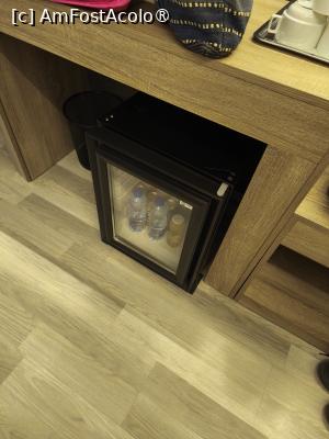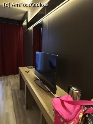 În fața paturilor se află un birou cu minibarul (contracost), iar pe tava am gasit o cană fierbător, cesti, pliculețe de ceai, ness și zahăr. Și tot aici un tv lcd.