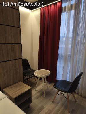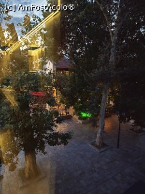Camera nu are balcon. De fapt, hotelul nu are balcoane. Lângă ferestre mai găsim doua scaune si o masuta. De la noi din camera se vedea intrarea din Bazarul Vechi si o zona de promenada, iar seara ne uitam la Crucea Mileniului.
