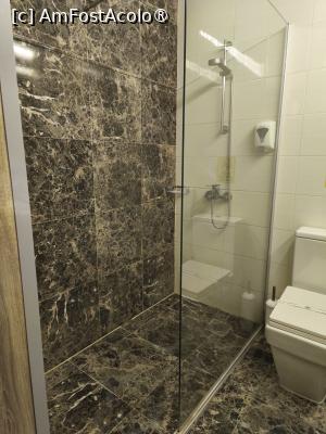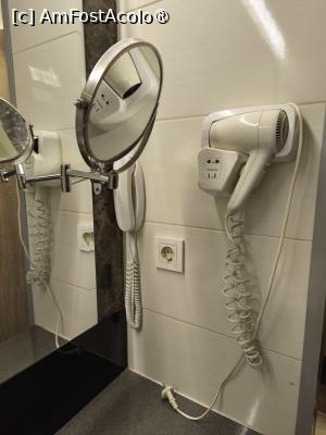 Baia foarte generoasa în ceea ce privește zona dușului walk-in. Am beneficiat de seturi complete de prosoape albe și papucii de unică folosință, oglindă cosmetică, uscător de păr.