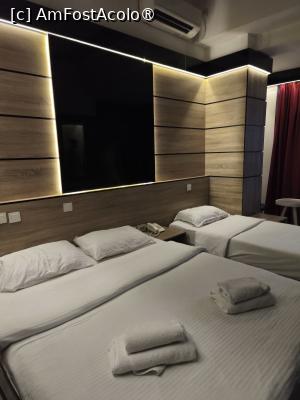 Un mic hol, în dreapta baia, în față camera propriu-zisă. Pe hol este amplasat un dulap deschis cu umerașe si un spațiu de bagaje. Un pat mare dublu si inca unul de o persoana separate de o noptiera, fiecare cu saltele foarte comode. Prize si intrerupatoare la indemana. Led-uri in jurul tavanului, fac posibila luminarea camerei.