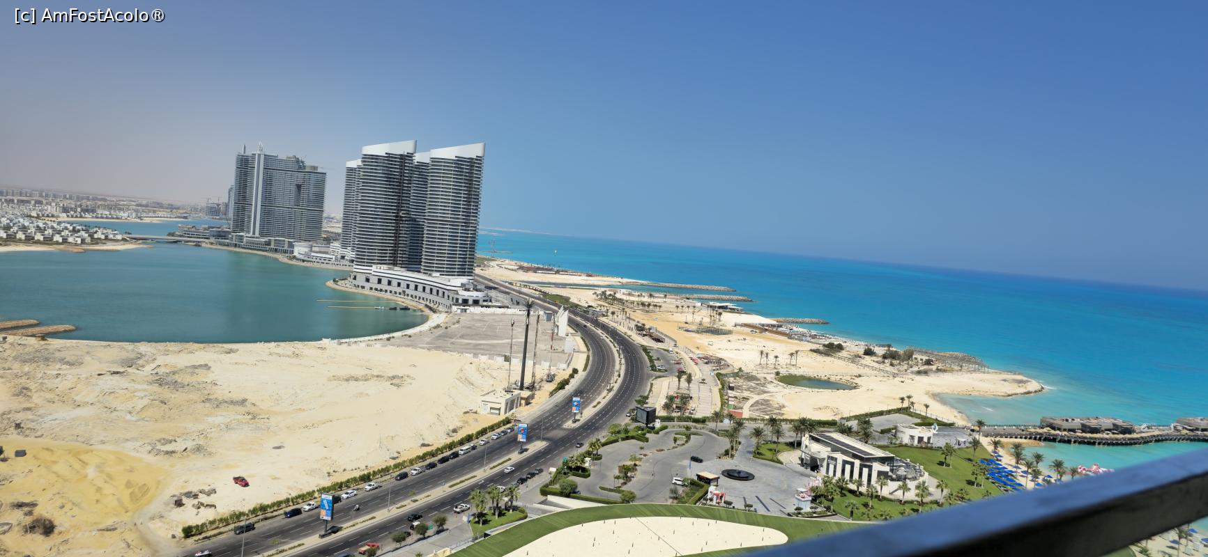 Urcat în avion, m-am bucurat de locurile pe partea dreaptă a acestuia. Speram să fotografiez, din avion, un frumos apus de soare. Având în vedere ziua mai scurtă și ora târzie a decolării, nu am reușit mare lucru. Dar, marea surpriză a venit spre sfârșitul zborului. Multiplele zboruri din anii ’80 au fost pe timp de zi, cu escală la Atena. După ce traversam insula Creta, Egiptul ne întâmpina cu o plajă infinită și pustie, undeva la vest de Alexandria. De data asta, în hubloul avionului apare un șir infinit de lumini. Realizez că astăzi țărmul Mediteranei nu mai este pustiu. Aveam să aflu peste câteva zile că este o politică de stat să dezvolte multe noi stațiuni pe acest litoral, care să rivalizeze, sau chiar să întreacă stațiunile de la Marea Roșie. Au început cu infrastructura: două aeroporturi internaționale (El Alamein și Marsa Matrouh) și o autostradă modernă, cu 3 benzi pe sens și o mulțime de intersecții cu sensuri giratorii suspendate. Au urmat mii și mii de construcții, unele finalizate, altele la stadiul de structură, așteptând investitori. De altfel, în cele două ieșiri din hotel, pe o distanță de circa 240 km în lungul coastei, am văzut puține zone încă neocupate. Iar New Alamein, stațiunea unde este „Rixos Premium” , nu are o vechime mai mare de 6 -7 ani.