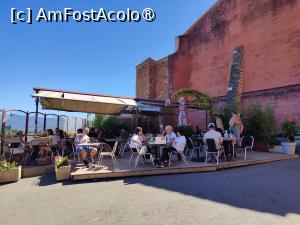 Am parcat prima dată undeva, jos, lângă o biserică. La scurtă distanță se aflau 2 restaurante, unul era deschis doar pentru cină, iar celălalt tocmai închidea. Am luat GoogleMaps la puricat și am descoperit pe planul superior al satului (acolo unde e de fapt centrul vechi) o cârciumă cu program continuu. Yes! Ne-am urcat în mașină și ne-am dus rapid. Țeapă; între prânz și cină nu serveau decât băuturi. Și ce priveliște minunată am fi avut de la terasa suspendată!... Ce irosire de oportunitate...