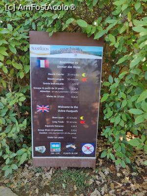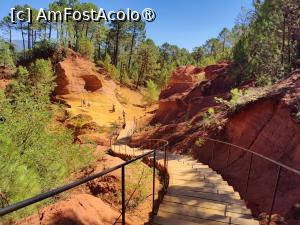 Plimbarea a fost extrem de plăcută, deloc dificilă, deși pe alocuri e de urcat/coborât. Contrastul pe care limonitul roșu/porocaliu/galben îl face cu vegetația verde-crud este imprevizibil și absolut minunat, un regal pentru ochi și inimi! Din loc în loc sunt montate panouri informative bilingve (franceză și engleză) însoțite de grafice și fotografii, cu explicații despre istoria zonei, despre întrebuințările limonitului, despre floră și faună. Sunt și câteva locuri de odihnă. Singura problemă e că se cam murdăresc încălțările de la praful de pe cărări; în parcare văzusem oameni care-și schimbau sandalele cu pantofi închiși și acum înțelegeam de ce. În fine, ne-am prăfuit un pic, dar n-a fost ceva iremediabil. Mi-a plăcut foarte mult această mică plimbare, locul e cu adevărat deosebit! Se poate vizita și vechea fabrică, dar am decis să n-o facem.